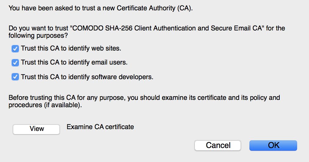 - Select the Sectigo RSA Client Authentication and Secure Email CA.cer file that you saved to your Desktop for import. In the pop-up dialog please select all of the checkboxes and click OK.